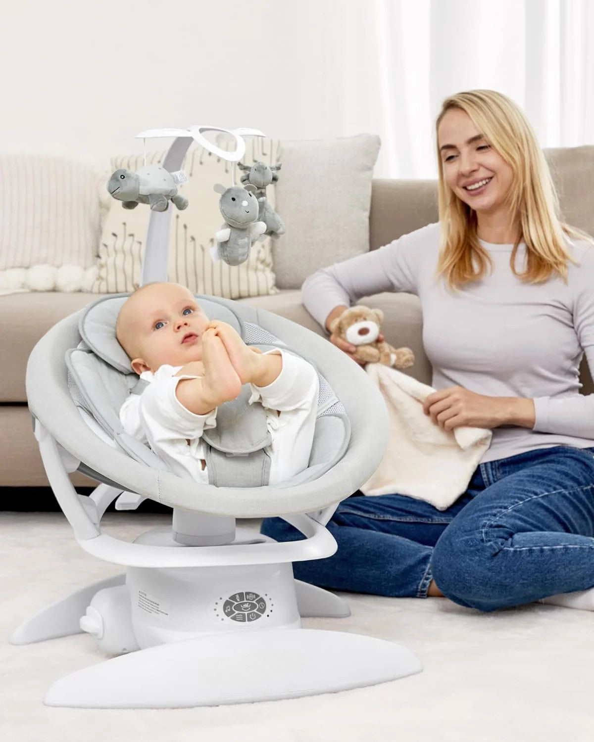 The removable toybar keeps your little one engaged with three soft plush toys. Easily detachable and adjustable, it ensures fun during every session.