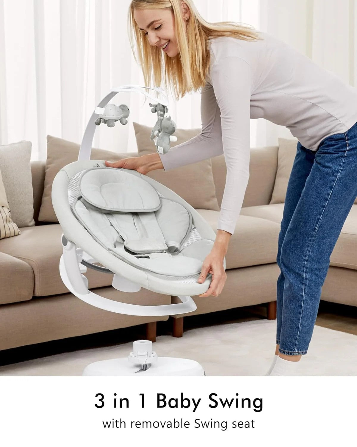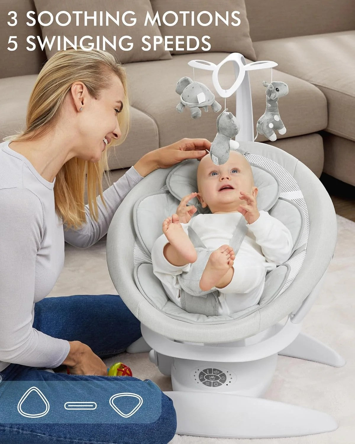 Experience unmatched comfort and flexibility with this versatile baby swing. Designed for soothing, playing, and relaxing, it effortlessly transitions between swing, stationary seat, and calming lounger.