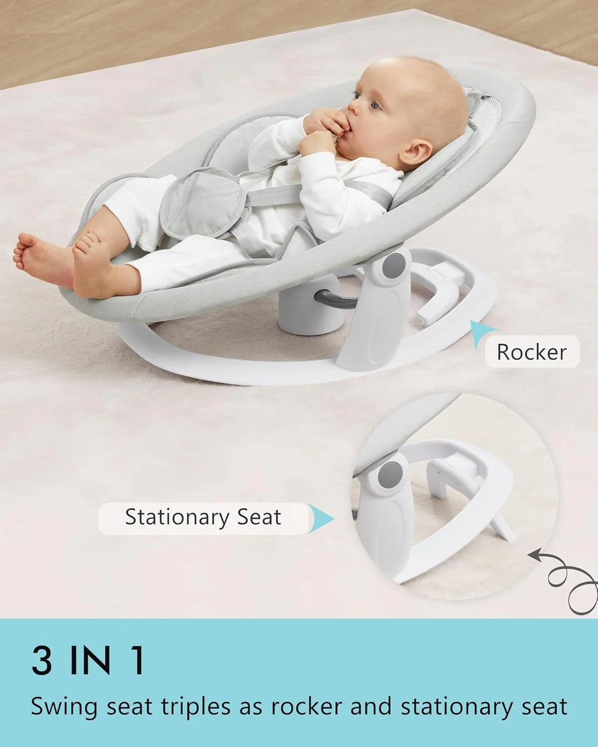 Rotate the seat in any direction for better interaction and positioning. This feature adds convenience for feeding, soothing, or supervising from any angle.